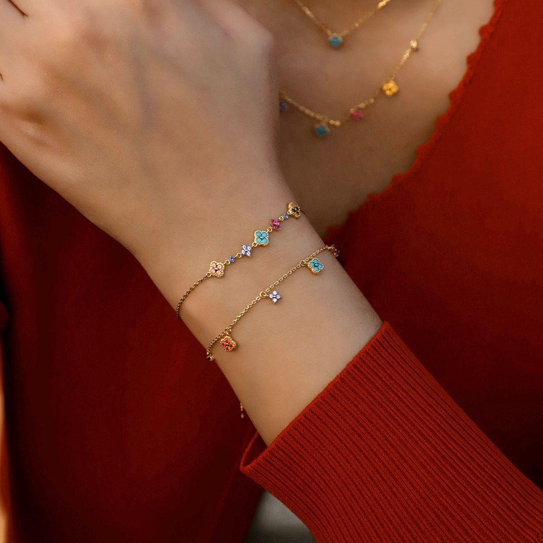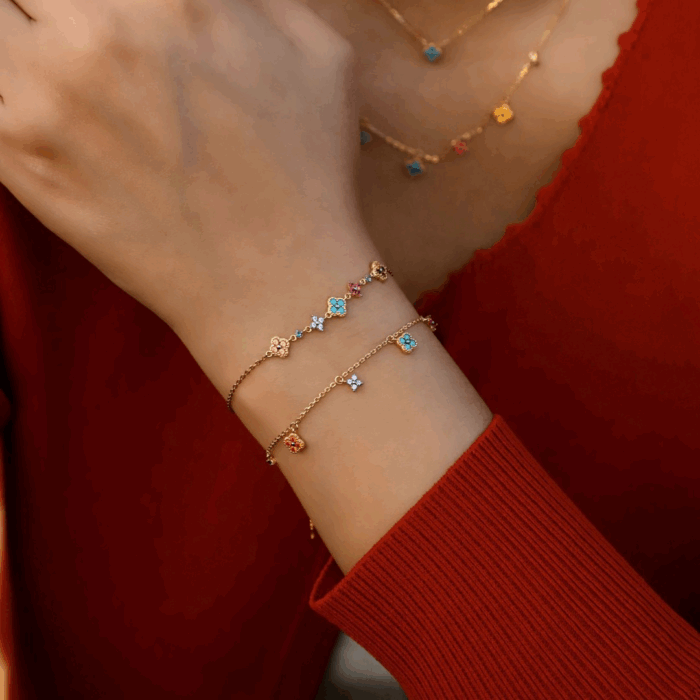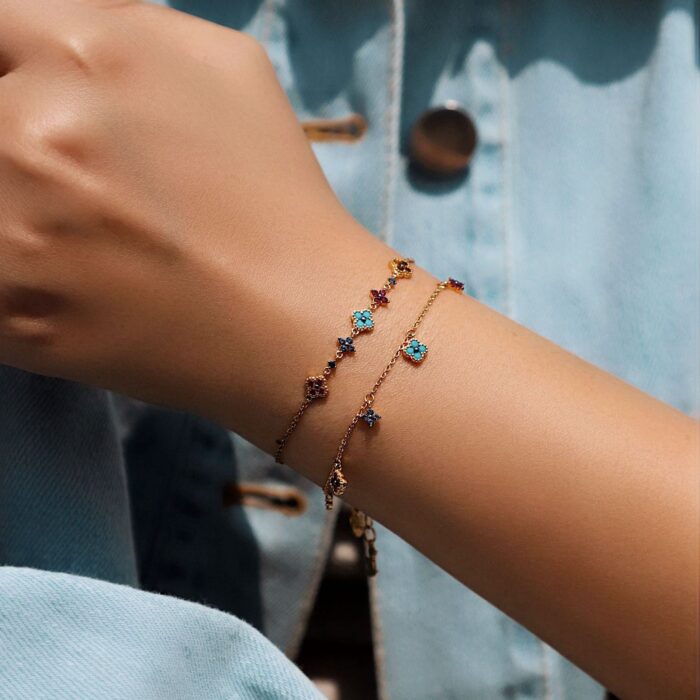 A refined piece crafted from sterling silver and set with 5A-grade zirconia stones in soft blue and violet tones. Lightweight, adjustable, and hypoallergenic — made for effortless, everyday elegance.